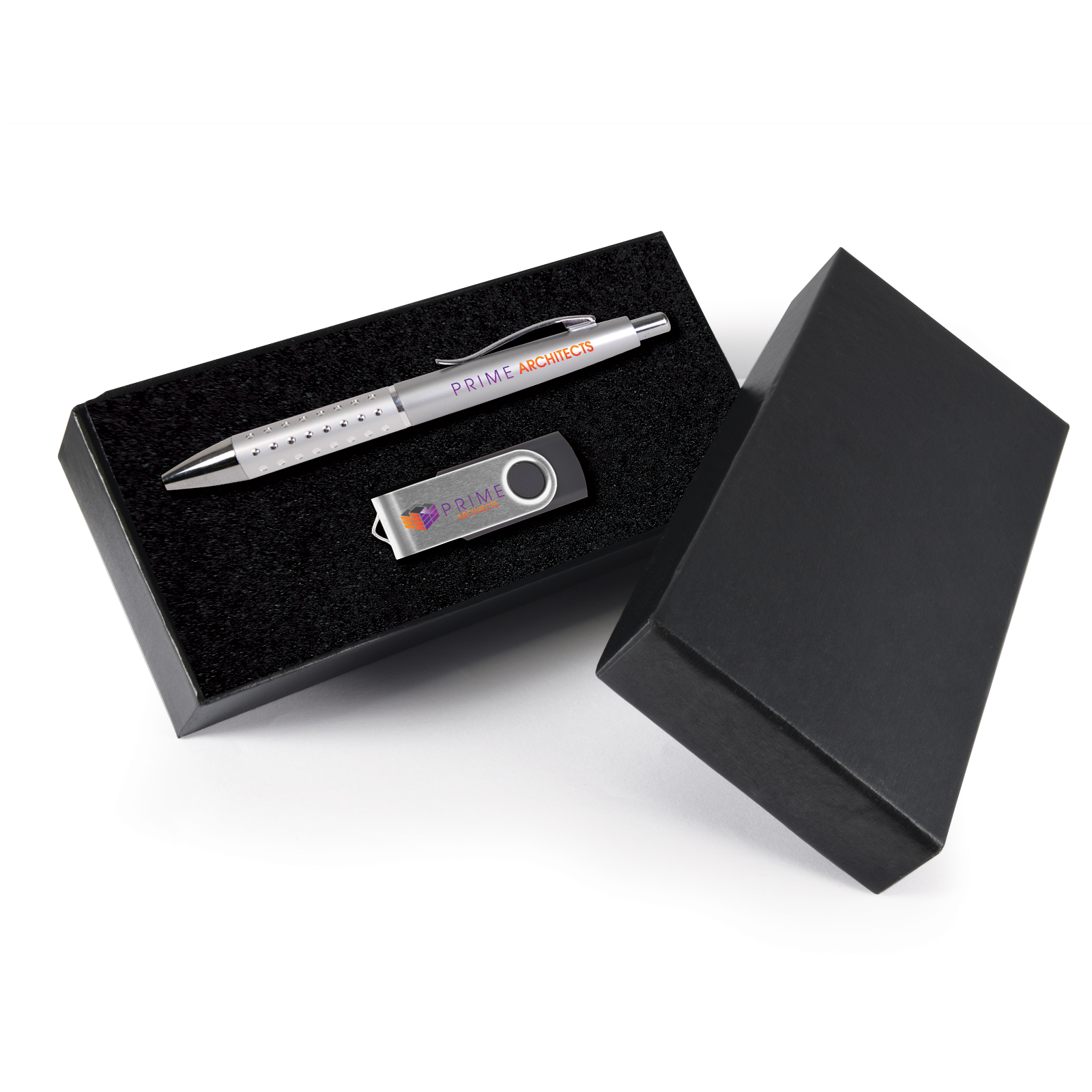 Gift set of Bling Pen and 4GB Swivel Flash Drive packed in 2 piece cardboard gift box with laser cut foam insert.